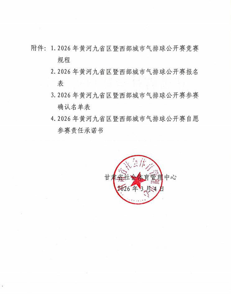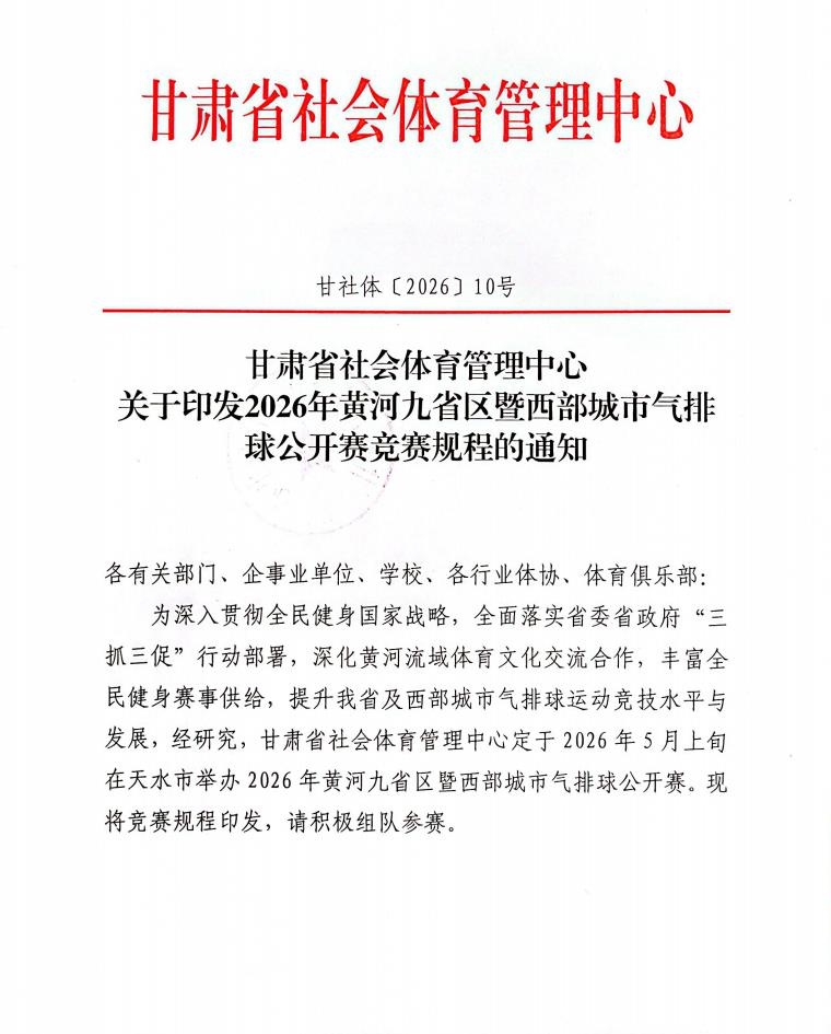 上一条信息: 兰州市体育局关于选拔运动员补充甘肃省青少年排球项目高水平运动队的公告          下一条信息: 关于印发2026年黄河九省区暨西部城市气排球公开赛竞赛规程的通知
