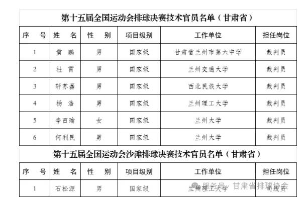 日前,国家体育总局竞技体育司公示了中华人民共和国第十五届运动会部分项目决赛阶段技术官员名单,其中,我省国家级裁判员黄鹏、杜霄、轩苏磊、杨浩、李百瑜、何利民6人入选排球项目决赛技术官员,石松源入选沙滩排球项目决赛技术官员,入选人数创历史新高!