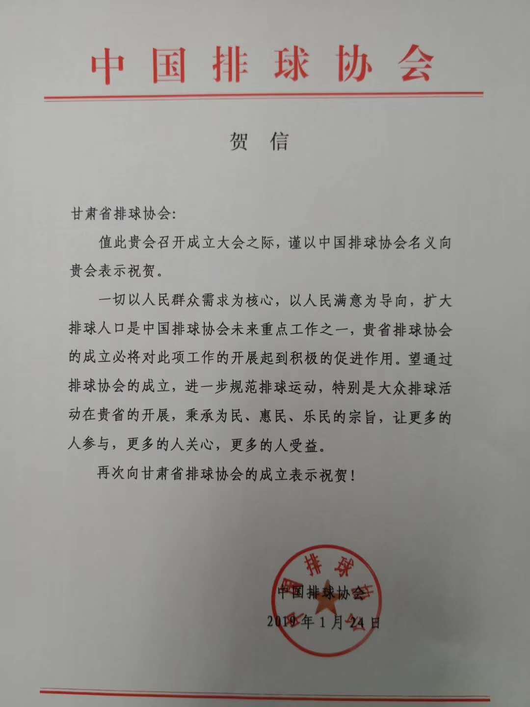 2019年1月28日上午,甘肃省排球协会第一届会员代表大会暨成立大会在兰州召开。来自全省各地120多名会员代表参加了此次会议。会上,省体育局、省民政厅有关领导宣读了甘肃省排球协会成立的批文。大会选举产生了第一届甘肃省排球协会理事会和领导班子。魏直洲当选为第一届省排协主席;任向东当选为副主席;冯涛当选为秘书长。选举产生了常务理事9人,理事27人。中国排球协会及兄弟省市排球协会纷纷发来贺信、贺电对甘肃省排球协会的成立表示祝贺!